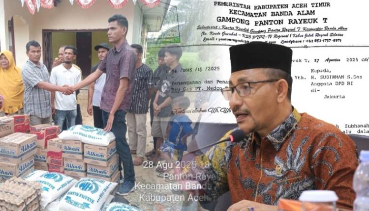 ACEH TIMUR, Harnasnews – Anggota Dewan Perwakilan Daerah Republik Indonesia (DPD-RI) asal Aceh, H. Sudirman atau yang akrab disapa Haji Uma, menyalurkan bantuan sembako kepada warga Gampong Panton Rayeuk T, Kecamatan Banda Alam, Kabupaten Aceh Timur, yang terpaksa mengungsi akibat dampak bau gas dari aktivitas operasional PT. Medco E&P Malaka.