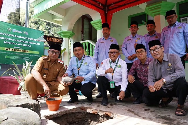 KOTA KEDIRI,Harnasnews – Momentum Hari Amal Bakti Kementerian Agama ke-80 dimaknai secara nyata oleh Kantor Kemenag Kota Kediri. Wakil Wali Kota Kediri Qowimuddin—akrab disapa Gus Qowim—melakukan peletakan batu pertama renovasi Musala Al-Ikhlas Kantor Kemenag Kota Kediri, sekaligus menyerahkan tali asih bakti sosial kepada para penerima manfaat, Selasa (16/12/2025).