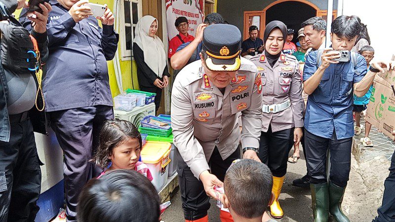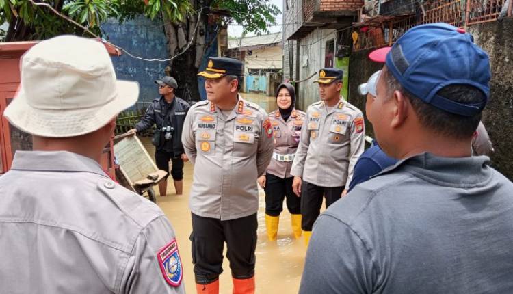 Kapolres Metro Bekasi Kota Kombes Pol Kusumo Wahyu Bintoro didampingi Wakapolres AKBP Bayu Pratama Gubunagi dan Kapolsek Bekasi Utara Kompol Imam Safi’i datang dengan membawa sejumlah bantuan kepada korban terdampak banjir.