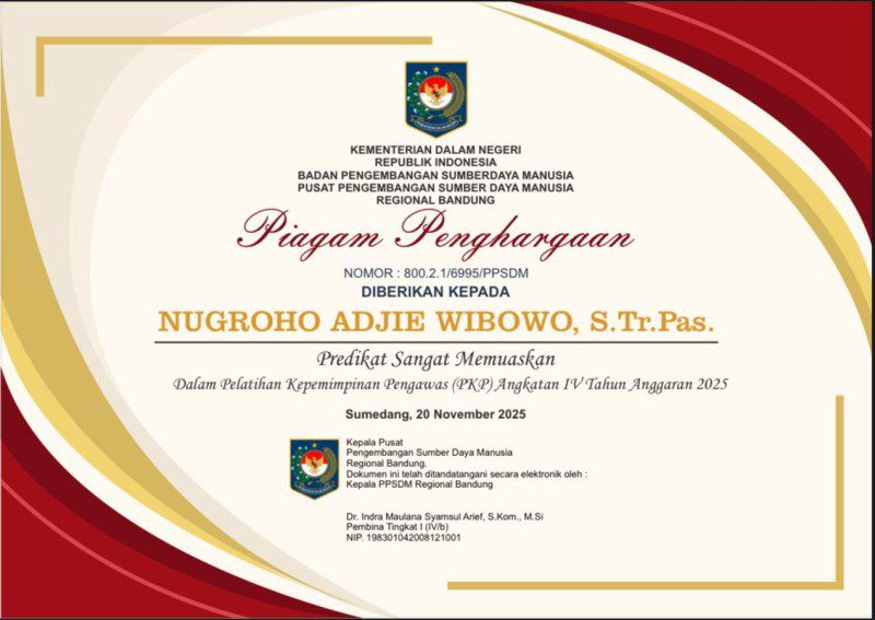 Predikat Lulusan Terbaik Pelatihan Kepemimpinan Pengawas Angkatan IV Tahun 2025 Di Raih Nugroho Adjie Wibowo