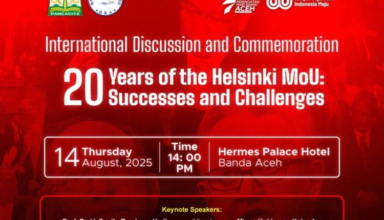 BANDA ACEH, Harnasnews – Ratusan tokoh nasional dan internasional, termasuk akademisi, aktivis LSM, dan diplomat dari 12 negara, akan hadir dalam Diskusi dan Peringatan Internasional 20 Tahun MoU Helsinki: “Progress and Challenges” pada Kamis, 14 Agustus 2025 di Hermes Palace Hotel, Banda Aceh.