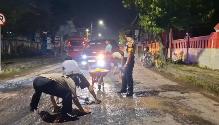 Awak media yang berada dilokasi kecelakaan di Jl. Imam Bonjol disuguhkan pemandangan anggota Polri berseragam dinas mengaduk material pasir, batu kerikil dan semen membuat adonan semen untuk menambal jalan berlubang.